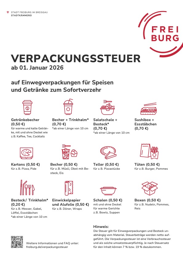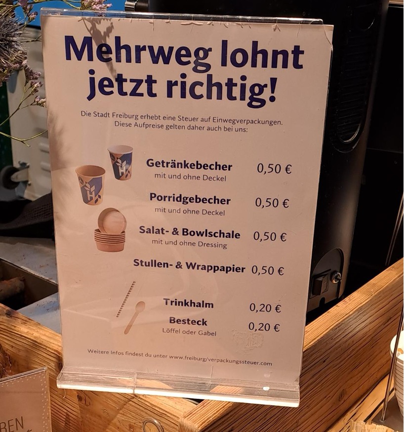 Following a long political dispute at the municipal level, Freiburg city council cast a narrow vote in May 2025 to introduce a municipal tax on single-use packaging for takeaway food and beverages. As of January 2026, the tax applies to disposable beverage cups, takeaway food containers, cutlery and similar single-use items intended for immediate consumption. For each disposable cup, box or other single-use container, a tax of 50 cents will be charged, while single-use cutlery is taxed at 20 cents per item (see photo 2). The tax is formally levied on businesses such as takeaway restaurants, although the costs are likely to be passed on to consumers.